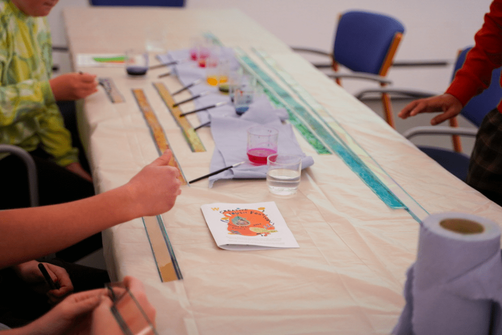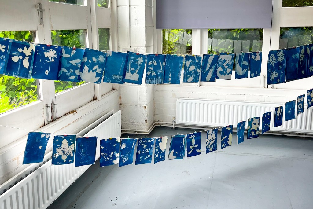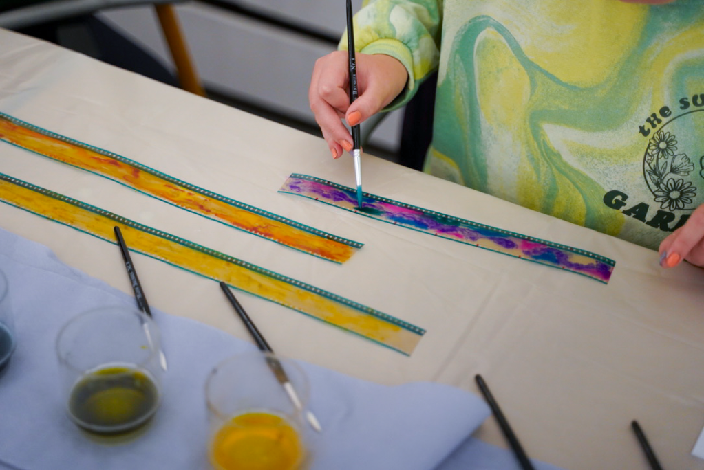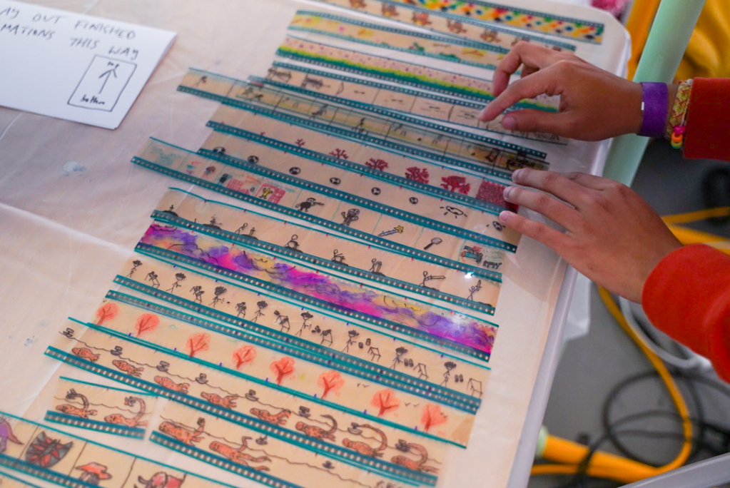 1-3: Direct animation workshop at annual Creative Youth Festival, Wysing Arts Centre, Cambridge, 2023. Photo credit: Nurbanu Asena; 4-6: Collaborative cameraless filmmaking and expanded cinema workshop for Stage 2 BA Fine Art students at Central Saint Martins, UAL, London, 2023; 7: Parol-making workshop with Theo Bolante for ‘I Said Fruit Salad’ exhibition at Hypha Studios, London, 2023; 8: Cyanotype workshop for Year Seven St Peter’s School students at Wysing Arts Centre, Cambridge, 2024.