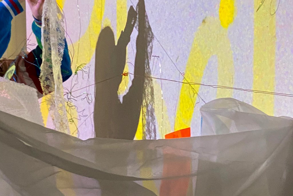 Installation details of ‘Who Knows Where the Time Goes?’ (2023-ongoing). Presented here as looped multi-channel projection on multiple tapestries: turmeric, indigo, avocado, weld, spinach, poppy, marigold, and cyanotype dyes on cotton and silk, 400cm x 250cm x 150cm.